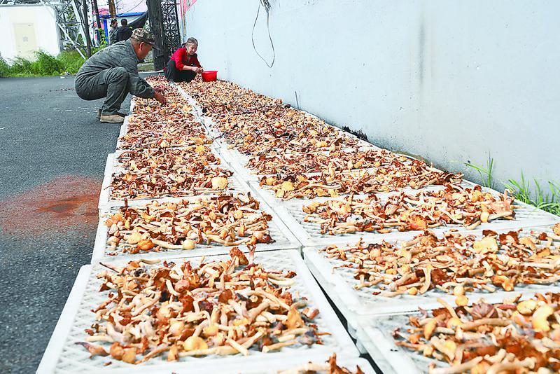 职工群众在晾晒野生蘑菇。