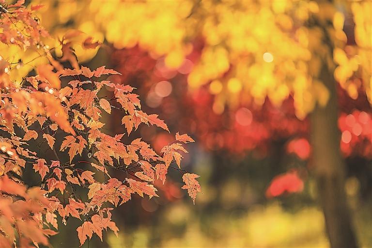 秋雨洗礼之后,树叶不再满足于单一的绿色,开始了一场色彩的竞赛。从深绿到浅黄,从淡红到暗红,再到褐色,各种颜色交织在一起,把山峦装扮成“五花山”。