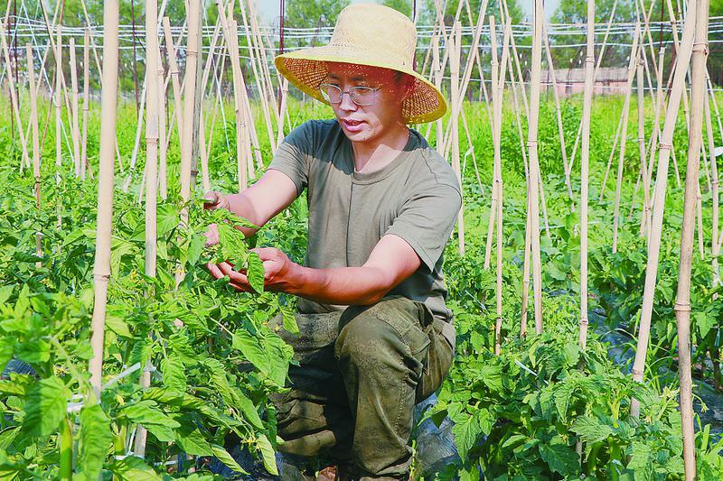 “番茄男孩”蔬菜团队专家于世亮正在察看番茄苗的生长情况。
