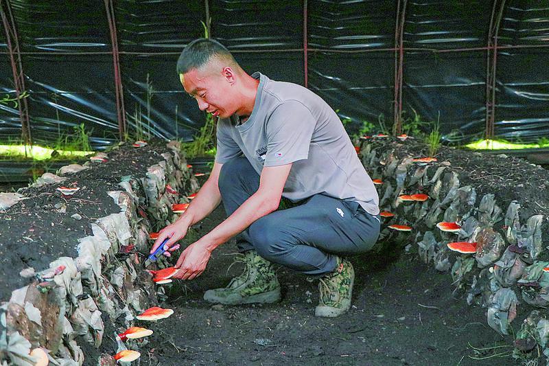食用菌研究室副主任胡海冰正在细心照料菌菇。